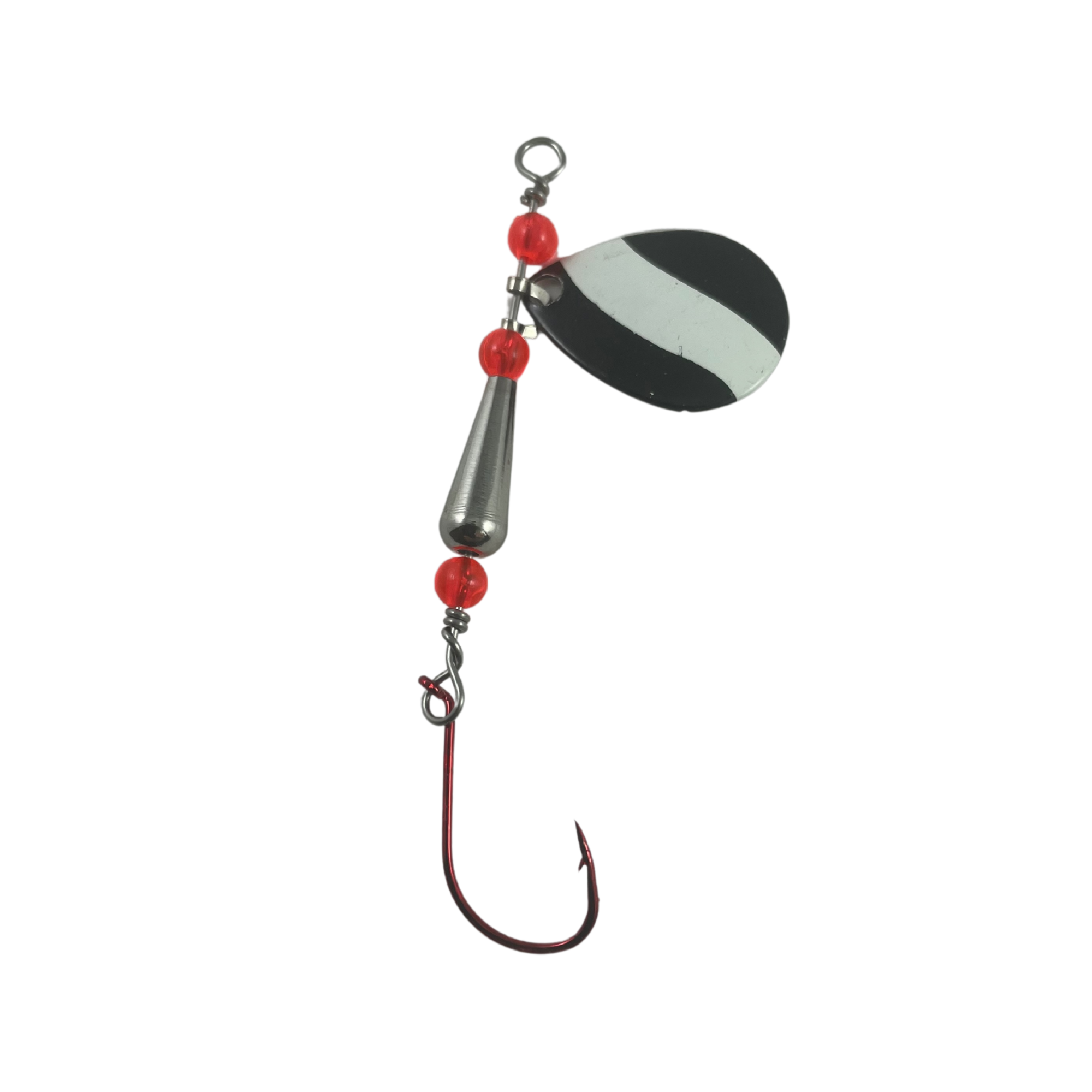 This is one of the latest in our series of Trout Spinner Blade lures. This lure uses a Black with a White stripe Colorado size 2 spinner blade, with Salmon Red Beads and a .070 ounce nickel lure body. This Trout lure comes with a red Size 1 single hook.